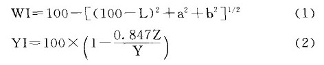 试样的三刺激值X、Y、Z及I a b值在Data color600电脑测配色仪上测定,采用D65光源和 lo。观察角。亨特白度(WI)用式(1)计算,黄度(YI) 用式(2)计算: