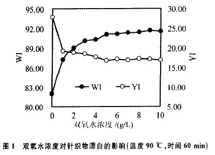 双氧水浓度对织物白度的影响结果如图1所示。由图l可知,随着双氧水浓度的升高,织物白度逐渐提高。当浓度小于5 g/I 时,随着浓度的增加,