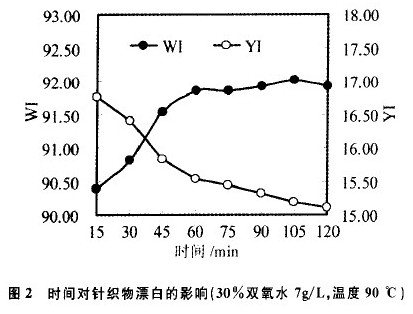 为了确定不同处理时间和温度对竹纤维织物漂白效果的影响,本文选定漂白温度90℃ ,30% H2O27 g/L时不同时间及漂白时问60 min,30% H 2O2 7 g/l时不同漂白温度条件下测试漂白效果,所得结果如图2、图3所示。