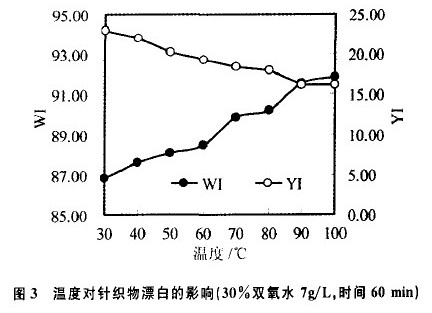 温度对竹纤维漂白效果的影响如图3所示,随着温度的升高,织物白度逐渐提高,黄度逐渐下降。在30~60℃ 时由于温度较低,双氧水分解速率缓慢,白度提高较慢;60℃以后,温度升高,双氧水分解速率不断加快,当温度为9O~100℃时,双氧水的分解率达90%,白度最高。因此综上所述,在此条件下,选择漂白温度为9O℃ 。