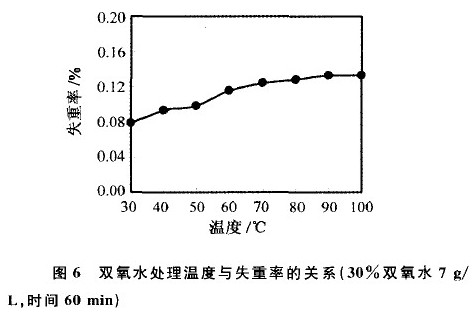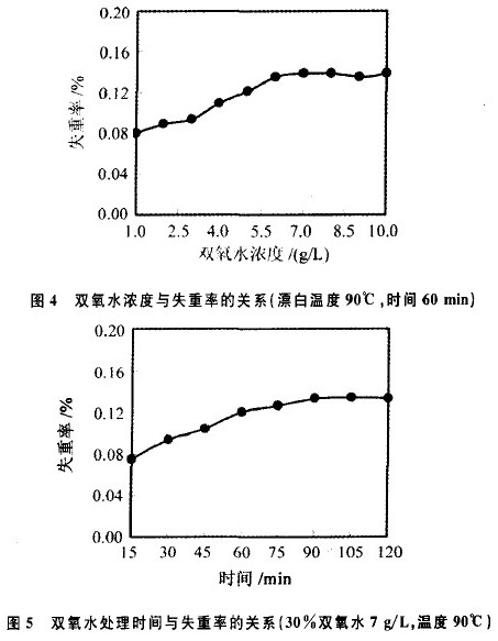 由图6可知,双氧水漂白时,纤维的失重率随温度的升高而升高,在90℃ 时基本达到最大,可以给予织物较高的白度。