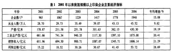 我国是世界上最大的纺织品生产国和出El国,目前约有l2 万家纺织企业。纺织工业是全国32个行业中的第三大行业,纺织工业增加值占我国工业增长总值的8%。表1反映了2001- 2006年我国规模以上印染企业的主要经济指标。