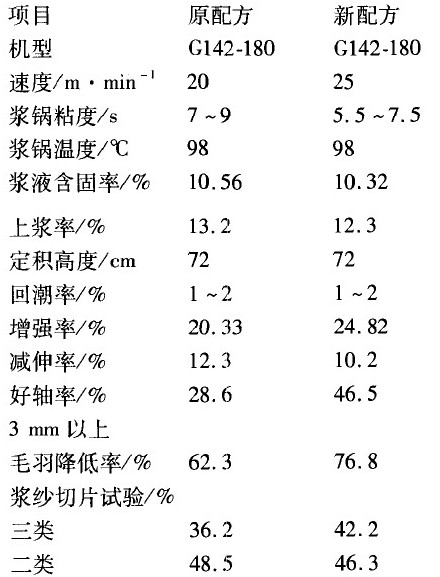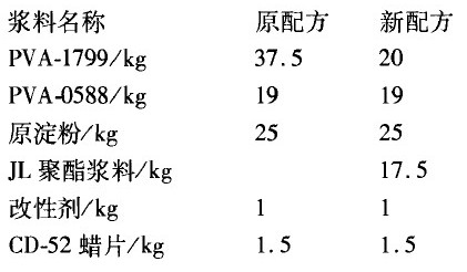 在配方中,加入适量的原淀粉和改性剂,用于进一步改善分纱性能,降低浆料成本;在助剂选择上,为了使浆膜表面平滑、柔软,减少静电产生,选用了CD一52蜡片。