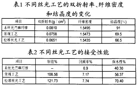 由于苎麻纤维的结晶度、取向度都大大高于棉纤维而延伸度却较低,其在烧碱溶液中的溶胀度也低于棉纤维,加上本身已有较好的光泽,在较大张力下以浓碱处理将大大降低苎麻纤维的活度,并影响手感,要解决这些问题除加强合理的退煮漂前处理工序外,还须改进丝光工艺和进一步处理好脱胶和研究纤维结构的改进及染料结构和色素的影响等。根据陶乃杰教授研究开发的松堆丝光工艺实践,证实合理的丝光工艺为浸轧 150—160克/升烧碱、松堆5分钟以上,延长纤维与烧碱的作用时间——扩幅——去碱,经生产实践证实松堆丝光工艺完全可达到改善染色性能,提高得色深度和鲜艳度的要求。(可见表1、表2、表3)