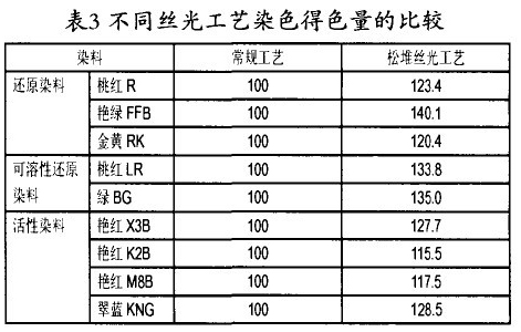 从上述测试数据完全证实松堆丝光工艺的双折射率、纤维密度和结晶度都有明显下降,其钡值、回潮率和保水性都有明显上升,各种染料的得色量都有明显提高(平均在25%左右)效果显著,同时还降低了烧碱回收的蒸汽消耗和回收设备的负荷,有利丝光机的操作,使丝光均匀并减轻染色得不匀性。