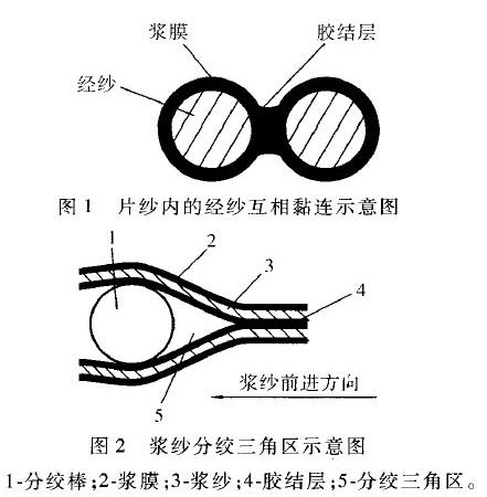 在经纱上浆过程中,当经纱与浆液接触后,就会吸附浆液。所吸附的浆液按照在经纱上的位置可以分成两部分:一部分浆液借助于压浆辊的压力和纤维之间孔隙的毛细管作用,浸透到经纱的内部,黏附于纤维之问的浆液经烘干之后便在纤维之间形成黏合性的胶层,对纤维实施黏合,增大了经纱的强度。另一部分浆液则会被覆在经纱的表面,当被烘干之后,便在经纱表面形成浆膜。