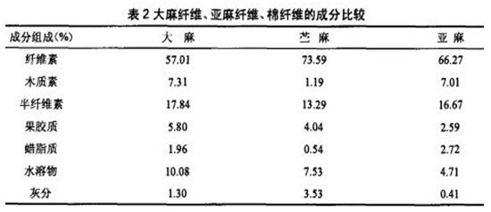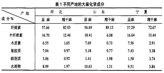 从大麻茎杆上直接剥离下来的称为原麻,原麻中除含有纤维素成分外还含有一定量的非纤维素成分,包括木质素、半纤维素、蜡脂质、果胶及部分水溶物和灰分等。若使原麻具有可纺性,必须把这些非纤维素成分去除,得到精干麻,即脱胶。大麻的脱胶因其自身结构及化学成分组成使得脱胶的难度大大高于亚麻和苎麻等,脱胶的效果直接影响到后道工序的进行,不同产地、不同品种甚至成熟度不同的大麻脱胶的效果都不同。表l为大麻纤维的结构及不同产地大麻的化学成分组成