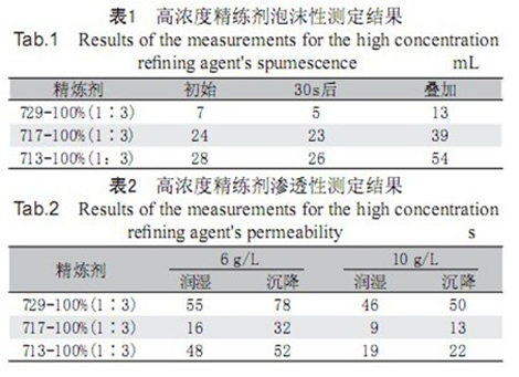 由表1、表2可知,该产品泡沫较低,其中729-100%远低于717-100%、713-100%的泡沫,但渗透性729-100%差于717-100%、713-100%。