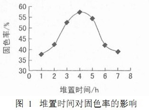 由图1可知,亚麻织物冷轧堆染色的最佳堆置时间为4h左右。堆置时间未达4h时,染料与纤维发生固色反应占主导地位;4h之后,固色反应基本完成,继续延长堆置时间,纤维上结合的染料发生水解断键的越来越多,固色率开始下降。