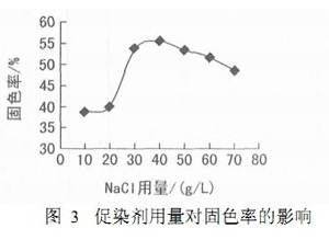 促染剂对活性染料冷轧堆染色也有较大影响。常用的促染剂氯化钠和硫酸钠可提高染料的直接性,调节染液中的电解质浓度,提高织物的固色率(图3)。本试验采用氯化钠作促染剂。