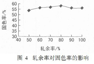 由图4可知,轧余率对固色率的影响不大。冷轧堆轧余率一般为60%~80%。轧余率要根据织物品种、前处理条件、轧车车速、轧辊硬度、染料/碱剂混合液的黏度和比重等进行适当调整。若染液对织物透芯渗透不够,应加入渗透剂,不宜采用提高轧压力的方法,因为提高压力后,轧余率下降,会使织物出现霜花,进而产生波纹疵病和缝头印等。