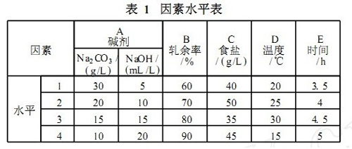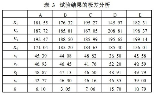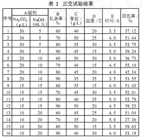 根据单因素对冷轧堆染色固色率的影响分析,采用正交试验法,以碱剂、堆置时间、堆置温度、促染剂用量、轧余率为因素,选取单因素试验时所得到的适宜工艺附近的四个水平值,作五因素四水平正交试验,见表1,即L(45),试验结果及极差分析如表2、3所示。