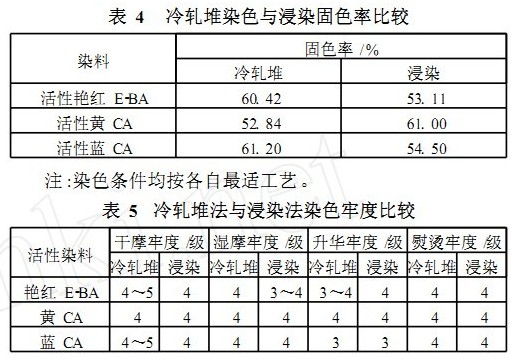 分别用冷轧堆和浸染两种方法对亚麻织物进行染色,比较固色率和染色牢度,结果见表4、5。