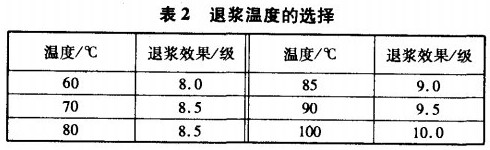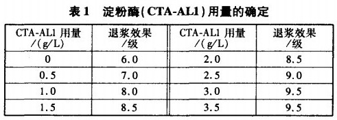 由表1可以看出,随着淀粉酶CTA—ALl用量增加,浆料的退除效果变好。淀粉酶CTA—ALl用量超过3.0g/L时,淀粉浆料已基本去除,再继续增加用量,浆料的去除情况变化不大。考虑处理成本,淀粉酶CTA—ALl的最佳用量定为3.0g/L。