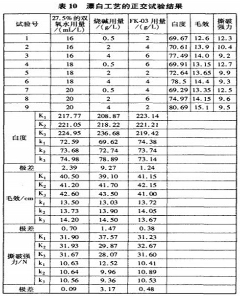 根据表9、10得出,对于白度、毛效和撕破强力。其影响因素均依次为:烧碱用量>双氧水用量>FK-03用量。对于白度来说,最佳工艺为:双氧水2OmL/L,烧碱4g/L,FK-032g/L;对于毛效来说,最佳工艺为:双氧水2OmL/L,烧碱4g/L,FK-03
