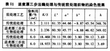 根据表11可知,退煮漂三步法生物前处理与传统前处理工艺相比,无论染料浓度大小,其染色性能相差甚微,染色效果可以达到应用要求。
