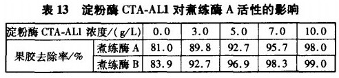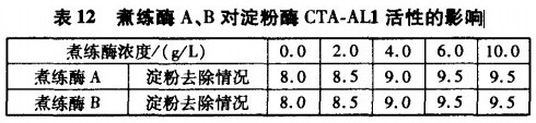 由表l2可以看出,煮练酶A和煮练酶B对淀粉酶CTA-ALl的退浆效果有促进作用,这说明它们对淀粉酶的活性没有负面影响。