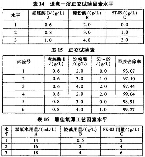 根据表l5得出,对于果胶去除率来说,其影响因素依次为:淀粉酶用量>ST-09用量>煮练酶用量;最佳工艺为:煮练酶用量1.0g/L,淀粉酶用量3.0g/L,ST-09用量1.0g/L,pH值8.5。