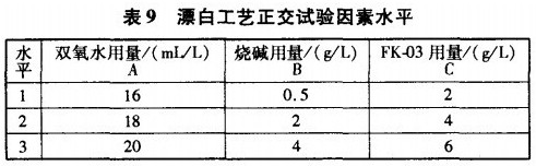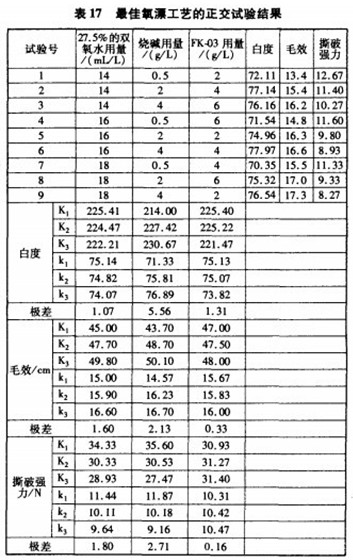 由表l7知,对于白度来说,氢氧化钠用量的影响最为重要;对毛效和撕破强力来说,影响因素依次为氢氧化钠用量>双氧水用量>FK-03用量。综上,确定最佳工艺为:氢氧化钠2g/L,双氧水l4mL/L。FK-034g/L。