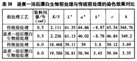 由表l8可以看出,与传统前处理工艺相比,采用退煮一浴法生物前处理的织物,无论染深色或浅