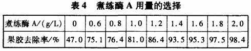 从表4可以看出,随着煮练酶A用量的增加,果胶去除情况越来越好。根据经验,果胶去除率达80%以上就可以满足精练的要求。综合成本等各因素,煮练酶A的最佳用量定为1.0g/L。