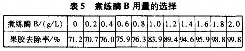从表5可以看出,随着煮练酶B用量的增加,果胶去除情况越来越好。综合成本等各因素,煮练酶B的最佳用量定为1.0g/L。