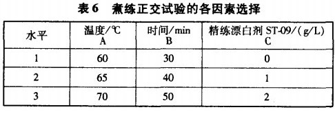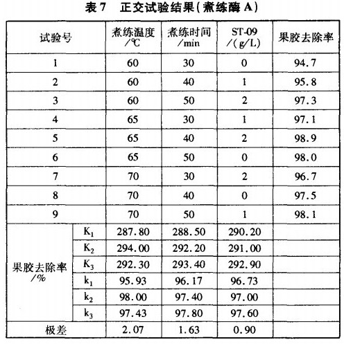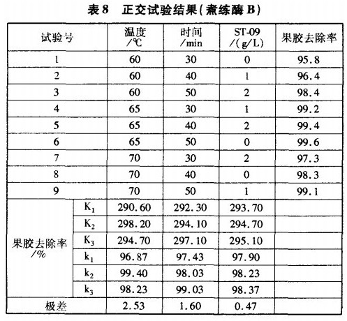 极差大者为主要因素,它的改变对试验结果影响较大。根据表7,对果胶去除率来说,影响因素的重要性依次为:煮练温度>煮练时间>酶活促进剂sT—O9的用量;最佳的工艺为:煮练温度65℃,煮练时间50min,ST一09用量2g/i~。pH值为8.5。