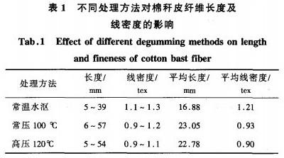 对棉秆皮分别进行常温水沤、常压脱胶和高压120℃脱胶处理后,测试不同方法处理后棉秆皮纤维的长度和线密度,结果如表1所示。