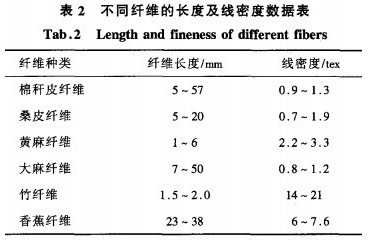 棉秆皮纤维的长度与线密度测试结果如表2所示,为便于与相近的天然纤维比较,表中还列出其他几种天然纤维的相关数据。
