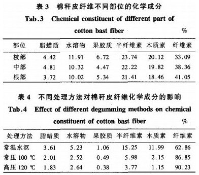 从表3可知,半纤维素和木质素的含量在棉秆皮中所占比例较高。从棉秆皮的枝部到根部,纤维素含量越来越高,半纤维素和木质素的含量越来越低。从表4可以看出,不同的处理方法,纤维素含量亦不同。常温水沤棉秆皮的纤维素含量较常压100℃、高压120℃脱胶的低。高压120℃脱胶后纤维素含量最高。常温水沤棉秆皮的半纤维素和木质素下降的量较其他2种少。常压100℃、高压120℃脱胶处理后的半纤维素和木质素下降非常明显。