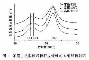 从图1可以看出,棉秆皮纤维主要衍射部分(101,101,002)分别出现在2θ为15.1。、16.1。和22.3。处,为典型纤维素I结构。温度的增加没有引起纤维素结构的变化,同样水沤和碱处理后的棉秆皮纤维仍属纤维素I结构。常温水沤棉秆皮纤维的x射线衍射图002部分峰形较平缓,然而经NaOH常压100℃、高压120℃脱胶处理的纤维,002部分峰形变尖,说明纤维素有序程度得到了提高。棉秆皮纤维的结晶度是通过002部分与101,101和002部分总的衍射面积比值来确定。