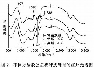 由文献[8—9]可知,图2中897cm-1处棉秆皮纤维中的8.D葡萄糖苷键特征峰吸收值变化很小,表明纤维素在常温水沤、常压100℃和高压120%脱胶过程中结构变化不大。从常温水沤处理的棉秆皮纤维的红外光谱图可知,1736cm-1处的吸收峰是半纤维素的特征峰,该峰经常压100℃和高压120℃脱胶处理后几乎消失,表明大量的半纤维素已经去除,这与表4的结果相符。1624cm-1处和1510cm-1处为木质素芳环振动吸收峰,在1624cm-1处变化不是很明显,但在1510cm-1处吸收峰趋于消失,说明高压120℃脱胶使木质素发生了降解,减少了木质素的含量。