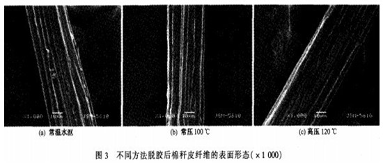 图3示出不同方法脱胶后棉秆皮纤维的表面形态。可以看出:棉秆皮纤维的表观直径在30—45um之间;常温水沤处理后的纤维表面最粗糙,常压100℃脱胶处理后的纤维表面较高压120℃脱胶处理后的粗糙,不平整。高压120℃脱胶处理后的棉秆皮纤维表面相当清晰、光滑,表明高压120℃脱胶后大部分木质素和半纤维素已经去除。