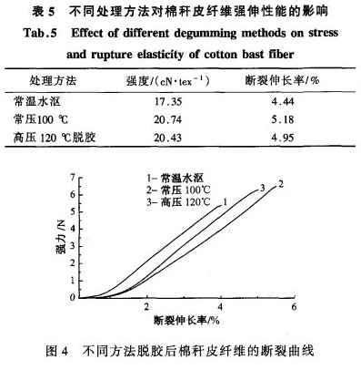 2)常温水沤处理后棉秆皮纤维的强力和断裂伸长率最低,而常压100℃脱胶处理后的最高;高压120℃脱胶处理过的棉秆皮纤维和常压100℃处理过的纤维强力和断裂伸长相差不多。
