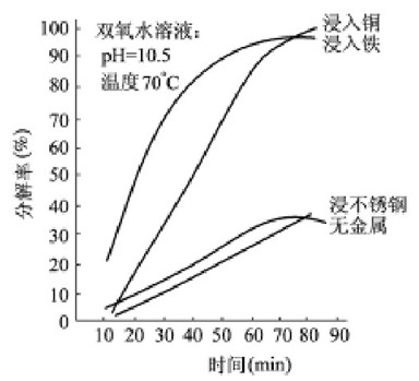(2)重金属会促进双氧水的分解,如铜、铁、铬、锌的化合物及尘埃等。从图3-2中可以看出在碱性条件下,70℃浸入铜、铁的双氧水的分解比没有铜、铁的双氧水的分解要快得多。