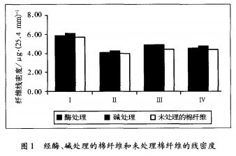 研究中,通过对不同种类的棉纤维的酶处理得出很多有意义的结论:经碱与酶脱胶处理后棉纤维线密度变大,而经碱处理的棉纤维线密度会变得大些。碱脱胶处理后棉纤维重量损失较多,而酶脱胶处理后棉纤维重量损失随酶的浓度的提高呈渐增趋势。不同地区、不同种类棉纤维由于对酶的活性不同而存在显著的差异。不同种类棉纤维