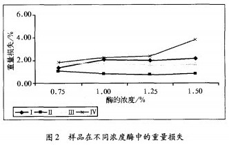 图2所示为实验中各样品经不同浓度酶处理后的重量损失情况。与酶处理的纤维相比,利用碱脱胶的纤维的重量损失更为明显;且随着酶浓度的增加,重量损失进一步加大。经给定浓度的酶处理后,各种棉纤维的重量损失程度也各有不同。通过溶剂(四氯化碳)提取的方法发现各种样品的重量损失程度非常接近,如1.8%~1.9%。这直接表明各地区不同种类的棉纤维在生物脱胶工艺中存在差异,而碱水解对纤维种类的要求则不明显。
