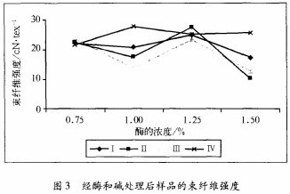 图3所示为经酶和碱处理后样品的束纤维强度。经碱和酶脱胶后各种棉纤维的束纤维强度表现出显著差异。碱脱胶过的棉纤维强度比酶处理后的强度低,这也验证了很多研究人员的结论。在各种浓度的酶处理液中,高浓度对强度减少的影响比低浓度的更为显著。在酶浓度最高时,尤其是样品重量损失较少时,其强度更接近经碱处理的样品强度。表1和表2分别分析了样品的重量损失和强度。