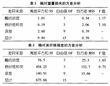 表中数据也证实了棉纤维的种类对酶的活性和其他性能起着积极作用。本实验中纤维种类是造成重量损失的主要因素(F值为7.10),而浓度不会形成重要影响。ANOVA分析(方差分析)的结论是对早期结论的补充。束纤维强度也可获得相似的结论。所观察到的各种棉纤维的显著差异可归结到棉纤维自身的差异上。