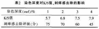 因此,染色深度增大,织物得色量增加,同时,染色深度增大,减弱了酶的活性,水解、降解作用减弱.刺痒感去除效果下降。