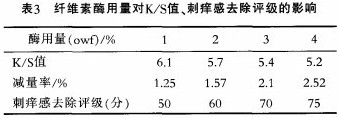 由表3看出.随着纤维素酶用量的提高.K/S值下降.刺痒感去除效果逐渐变好,减量率逐渐增大,织物强度逐渐减小,光泽变亮,刚度下降。其原因由纤维素酶的催化机理可知.纤维素酶浓度的提高会有更多的葡萄糖外切酶离开水相而转移到纤维的表面.加速纤维的水化反应.进而利于葡萄糖内切酶水解非结晶纤维素.以及葡萄糖苷酶分子水解纤维二糖和纤维三糖.所以织物表面毛羽被水解,光泽变亮,刺痒感去除效果变好。同时,毛羽去除减小染料上染阻力.织物的得色量增加