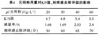 在纤维素酶(0)3%,活性BES红(owf)3%、染色温度55~60、pH值66.5、染色时间2Omin、碳酸纳20g/L、固色温度60cc、固色时间50min、浴比1:15的条件下.研究不同用量的元明粉其对织物K/S值、刺痒感去除评级的影响效果,结果如表4所示。