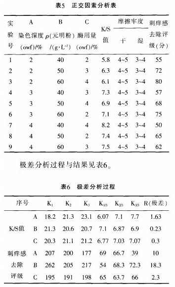 从上面的试验可以看出.固定碳酸钠的用量,刺痒感的强弱及得色量与染色深度、纤维素酶用量、元明粉用量有密切的关系。为了进一步研究各因素对刺痒感、得色量的综合影响,运用正交设计进行分析因素、水平设计及试验结果如表5所示。