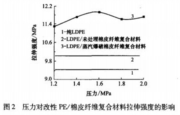 在温度23℃、湿度55%、拉伸速度为100mm/min的条件下,进行样条的拉伸性能测试。图2是压力对改性PE/棉皮纤维复合材料拉伸强度的影响(棉皮纤维质量分数为15%)。由图2可得,纯PE拉伸强度为9.4MPa。与纯PE相比,改性PE/棉皮纤维复合材料的拉伸性能分别提高了19.5%(压力为1.2MPa)和24.0%(压力为2.0MPa)。未处理PE/棉皮纤维复合材料的拉伸强度为10.0MPa。经过蒸汽爆破预处理的棉皮纤维拉伸强度由11.3MPa(压力为1.2MPa)增加到了11.7MPa(压力为2.0MPa),分别比未处理试样增加了12.3%和16.6%,分析其原因是蒸汽爆破预处理改变了棉皮纤维结构,提高了纤维表面粗糙度,增大了棉皮纤维与相容剂的接触面积,从而改善了棉皮纤维与PE的界面黏结性,这样使极富韧性的棉皮纤维与PE更好黏合,复合材料拉伸性能得到提高。