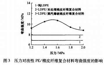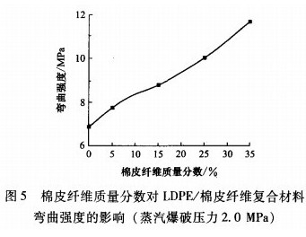 图5是棉皮纤维质量分数对LDPE/棉皮纤维复合材料弯曲强度的影响(蒸汽爆破压力