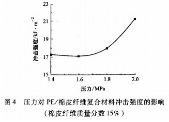 一般情况下,在塑料中填充高质量分数的未处理棉皮纤维,棉皮纤维容易团聚,与塑料的相容性差,容易造成应力集中,冲击性能差。图4是爆破压力对PE/棉皮纤维复合材料冲击强度的影响(棉皮纤维质量分数15%)。由图4看出,随着蒸汽爆破压力的增强,冲击性能增强。分析其原因是在一定爆破压力条件下,棉皮纤维的内部整体结构被破坏,各组织成分松散,棉皮纤维与PE的接触面积增加,且改性后棉皮纤维长径比提高,从而提高了复合材料的冲击强度。结果表明,爆破压力越大,对物料的破坏力就越大,越能够实现棉皮纤维的高效分离而改善冲击性能。