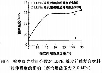 图6是棉皮纤维质量分数对LDPE/棉皮纤维复合材料拉伸强度的影响(蒸汽爆破压力2.0MPa)。由图6看出,随着棉皮纤维质量分数的增加,拉伸强度增强。当棉皮纤维质量分数为35%时,拉伸强度比纯LDPE增强了29.6%。说明蒸汽爆破后的具有一定长径比的棉皮纤维作为一种增强剂可以改善材料的拉伸性能。