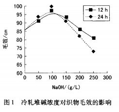 从图1可知,在碱浓度低于100g/L时,冷轧堆处理可使织物的毛效有一定的升高;当碱浓度超过150g/L时,毛效随碱浓度的升高急剧下降。