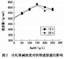 从图2可知,冷轧堆处理后织物的透湿性随碱浓度的升高而增大,当碱浓度为150g/L时达到最大,随后有所下降。碱浓度较低时,堆置时间对毛效和透湿性的影响较小;而碱浓度高时,堆置时间较长会急剧降低织物的毛效和透湿性。