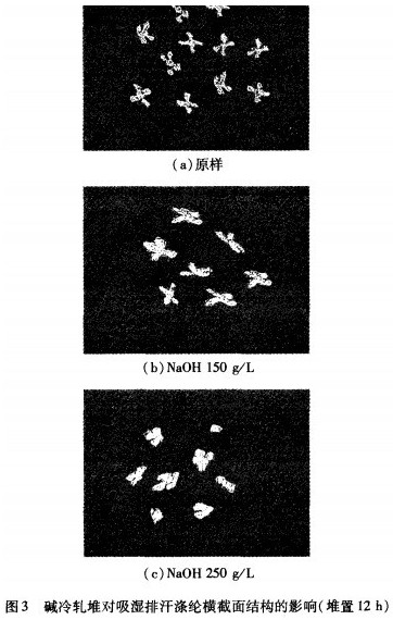图3中,堆置12h的条件下,150g/L的NaOH会局部损伤吸湿排汗涤纶纤维的表面沟槽,而250g,/L的Na0H会严重损伤吸湿排汗涤纶纤维表面沟槽。可见,冷轧堆对吸湿排汗涤纶织物的吸湿透湿性产生了较大的影响,在高碱